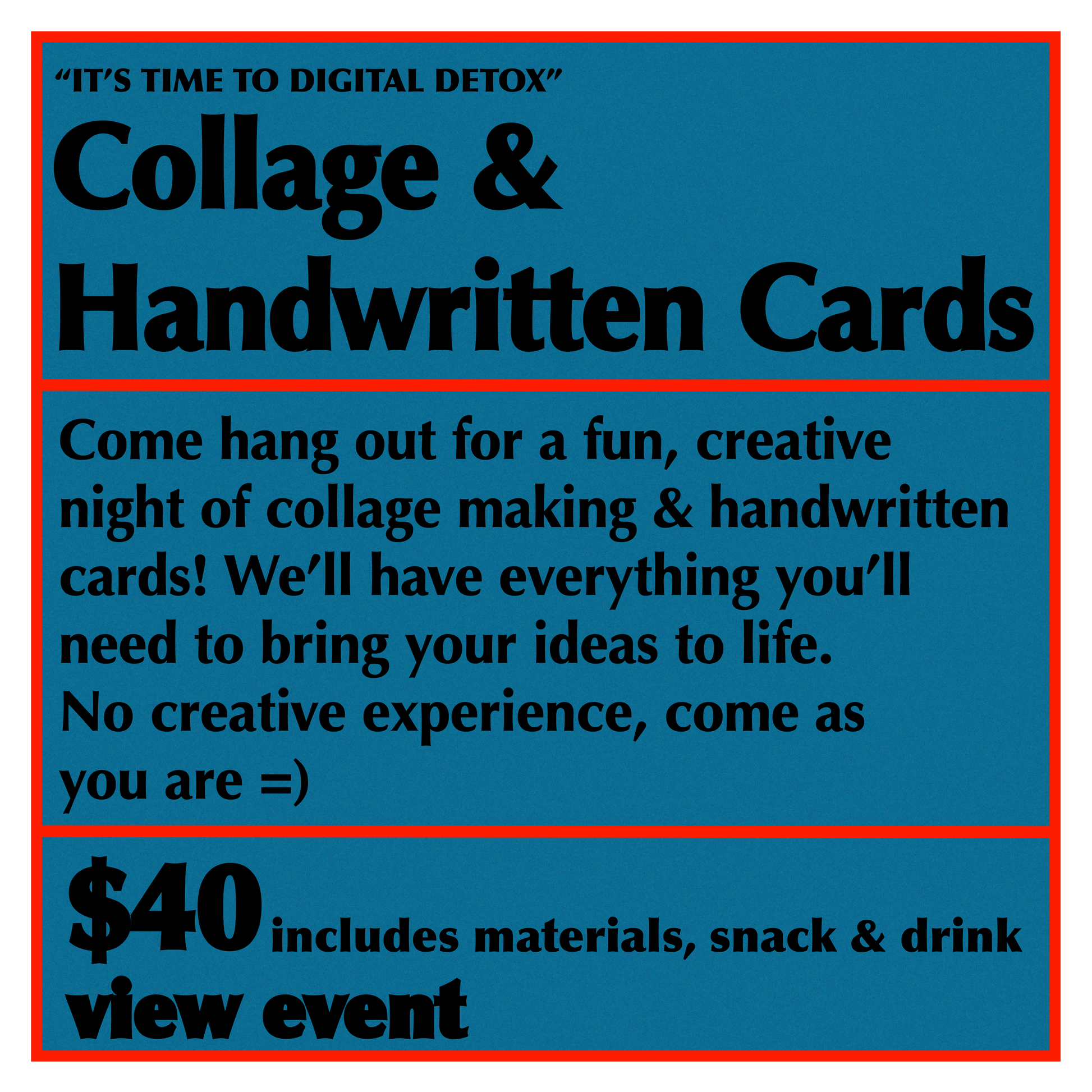 Come hang out for a fun, creative night of collage making and handwritten cards -a night perfect for connecting, sharing stories, laughing, and inspiring one another! While you write a note for a friend, make collages, you'll have plenty of chances to chat, collaborate, and connect.