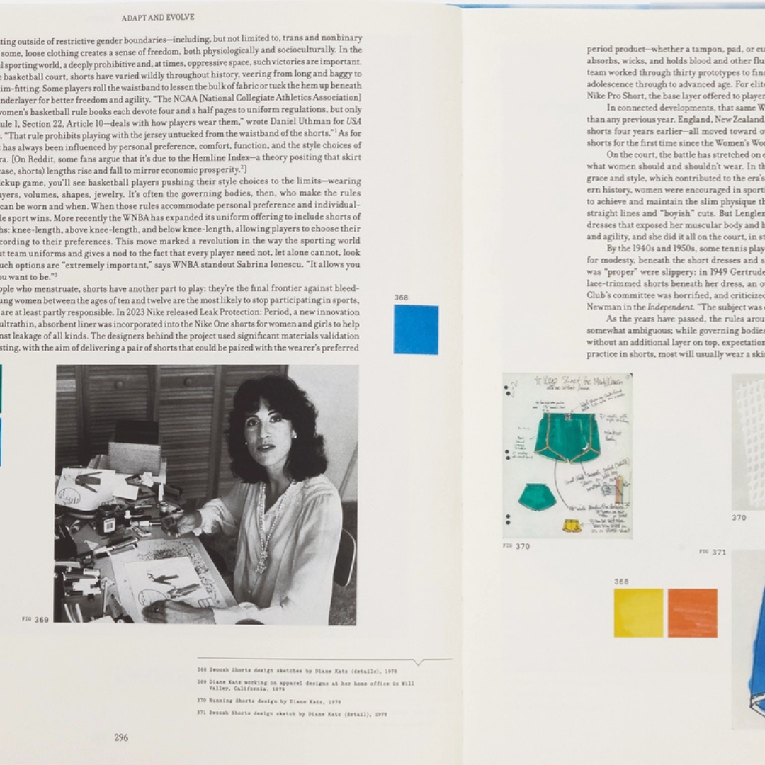 Look Good, Feel Good, Play Good visualizes the relationship between women and the garments they wear through five design archetypes from sporting history: warm-ups, jerseys, leggings, sport bras, and shorts. Steeped in narrative, history, and Nike’s abundant archive, the book’s rich imagery spans reproductions of Nike’s trade catalogues that date back to the early 1980s, period and contemporary photography, sketches, advertisements, fabric swatches, seasonal color palettes, original design proposals and patents, logos, product and campaign shots, and everything in between.