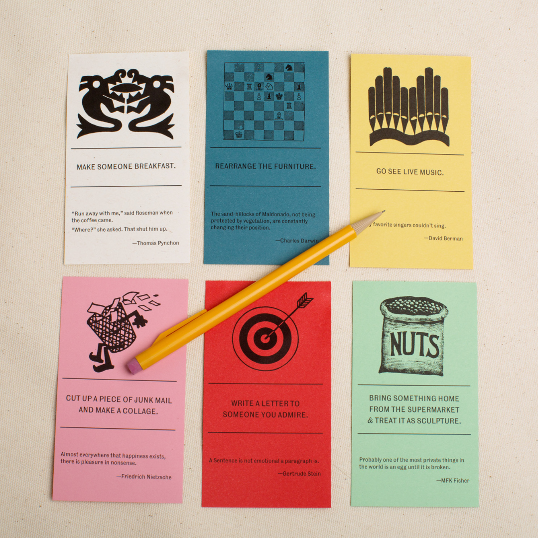 Featuring the kind of ingenious, charming design you expect from a Jason Fulford and Tamara Shopsin project, Offline Activities is designed as a coupon book with tear-out pages, with one inspirational suggestion and quote per page. You are encouraged to physically do the activity and rip the page out of the book as proof. If you do one offline activity per week, the book will last a year. Offline Activities is a delightfully analog, pleasantly practical guide to shaking up your offscreen life.